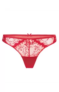 Koronkowe stringi damskie czerwone Romance LV-ST20 wykonane z delikatnej mikrofibry i tiulu, która subtelnie otula kobiece ciało. W zestawieniu ze zmysłowym haftem z przodu całość wygląda elegancko i seksownie. Majtki świetnie dopasowują się do sylwetki i efektownie podkreślają pośladki.