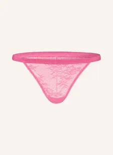 Nieprzezroczysty materiał z satyny z przodu. Tył z kwiatowej koronki. Elastyczny pas na wysokości bioder. Wysokie wycięcia na nogi. Środkowy szew dzielący z tyłu. Klin z bawełny. Średnie zakrycie pośladków. Pikotki. Koronka z rzęskami z tyłu