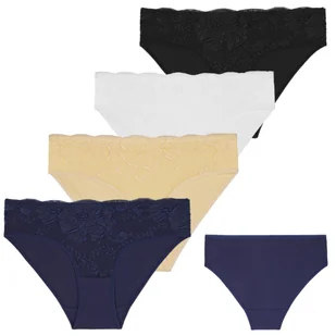 Majtki figi damskie: ✔️ z koronkowym przodem w kwiaty ✔️ 4-pak ✔️ kolory: czarny, biały, beż, granat ✔️ 95% bawełna, 5% elastan ✔️ elastyczna gumka w pasie N...