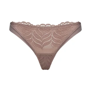Majtki stringi AURORA Esotiq | jasny brąz Stringi AURORA w jasnobrązowym odcieniu to połączenie subtelnej elegancji i nowoczesnej formy, stworzone z myślą o codziennym komforcie oraz zmysłowym wyglądzie. Model wyróżnia się delikatną, liściastą koronką zestawioną z gładką, miękką mikrofibrą o satynowym wykończeniu, która przyjemnie dopasowuje się do ciała. Krój w talii układa się w kształt litery V, co optycznie wydłuża nogi i podkreśla sylwetkę. Z przodu uwagę przyciąga koronkowa wstawka na transparentnej siateczce, subtelnie wychodzącej ponad linię pasa i tworzącej lekki, kobiecy efekt. Tył wykonano z gładkiej mikrofibry z delikatnym wykończeniem koronką, dzięki czemu stringi prezentują się wyjątkowo estetycznie i pozostają komfortowe w noszeniu.