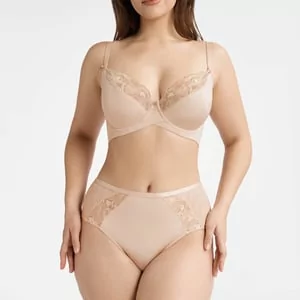 Majtki z wysokim stanem BETHANY to eleganckie, wysokie figi o klasycznym, pełnym, mocno zabudowanym kroju. Przód ozdobiony koronkowymi, transparentnymi wstawkami. Model delikatnie korygujący okolice brzucha. Majtki z wysokim stanem BETHANY w całości wykonano z elastycznego, gładkiego materiału, dzięki czemu nie odznaczają się pod ubraniem. wygodny fason zakrywający pośladki płaska, komfortowa gumka w pasie w kolorze beżowym Skład materiałowy: