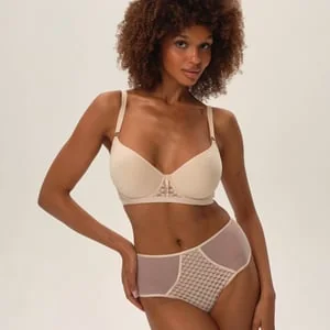 Efektowne majtki z wysokim stanem Ohara to must have dla miłośniczek oryginalnej bielizny. To niebanalne połączenie dwóch rodzajów meshu stanowi doskonałą alternatywę dla koronki. Przód i niewielki trójkącik z tyłu wykonano z siateczki ze wzorem, a tył i boki – z gładkiej. Dodatkową ozdobą tych beżowych zabudowanych majtek są potrójne dekoracyjne kółeczka. wysoki stan zakrywający dolną część brzucha dwa rodzaje meshu ozdobne kółeczka z tyłu Skład materiału: