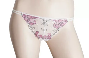 Efektowne stringi damskie, uszyte z cienkiej siateczki, ozdobione kwiatowym haftem.