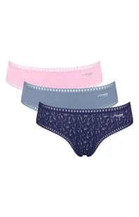 Sloggi 3-pack figi damskie Go Crush Hipster 10219671-V004 wykonany z wyjątkowo miękkiej bawełny organicznej z certyfikatem GOTS. Fason o głęboko wyciętych bokach i zabudowanej dolnej części zapewnia komfort noszenia i dobre dopasowanie. Każda para posiada elastyczne wykończenia z delikatnej koronki, które zwiększają wygodę i nadają subtelny wygląd. W zestawie znajdują się modele w stonowanych kolorach różowym, niebieskoszarym oraz granatowym z charakterystycznym nadrukiem. Idealne na co dzień, łączą styl, miękkość i dbałość o środowisko.
