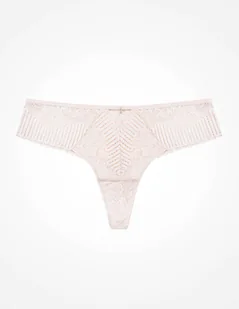 Kremowe damskie stringi Kenlee to subtelny model koronkowej bielizny. Majtki przyciągają wzrok zmysłowym, trójkątnym wycięciem tuż przy gumce, które zostało ozdobione drobnym detalem. Ponieważ koronkowe stringi Kenlee są nieco bardziej zabudowane na biodrach, pewnie trzymają się sylwetki. Modelka ma 180 cm wzrostu i ma rozmiar S. lekko prześwitująca koronka