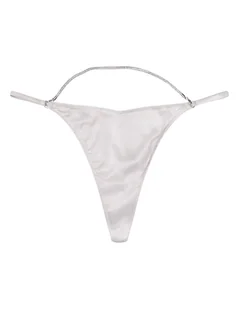 Oryginalne stringi Onyks to wyjątkowy model dla miłośniczek awangardowego designu. Łączą krój typu thongi z jasnoszarym odcieniem i satynowym materiałem, a także fantazyjnymi dekoracjami. Te damskie majtki z przodu ozdobiono możliwym do odpięcia sznureczkiem. Boki dekorują z kolei cienkie gumeczki. Dla komfortu w kroku znajduje się bawełniany klin.