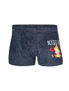 Bokserki męskie w granatowym kolorze, z nadrukiem zielonej żabki i napisem Kiss Me na nogawce. Kolekcja walentynkowa. Wygodny, dopasowany do ciała krój. Skład: 95% bawełna, 5% elastan.