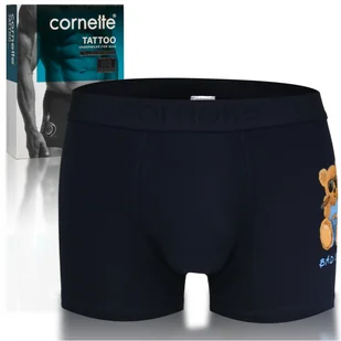 Cornette Bokserki Męskie Skład: bawełna 95%, elastan 5% Rozmiar M: Szerokość minimalna w gumce: ok. 32 cm Szerokość maksymalna w gumce: ok. 45 cm Długość nogawki zewnętrznej: