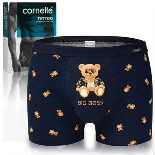 Cornette Bokserki Męskie Skład: bawełna 95%, elastan 5% Rozmiar XL: Szerokość minimalna w gumce: ok. 36 cm Szerokość maksymalna w gumce: ok. 50 cm Długość nogawki zewnętrznej: