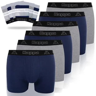 KAPPA Bokserki Męskie 6 sztuk Skład: Granatowe: 95% Bawełna; 5% Elastan Szare: 90% Bawełna; 5% Elastan, 5% Wiskoza Rozmiar XL Szerokość na gumce bez naciągania ok: 38 cm Maksymalne naciągnięcie w gumce ok: 50 cm Długość nogawki zewnętrznie ok:
