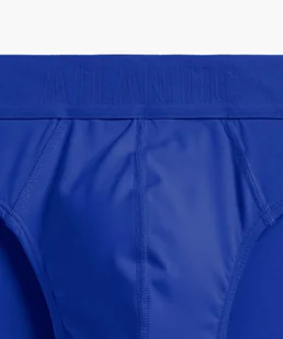 Slipy męskie o sportowym kroju, dość wysoko wycięte po bokach, niska talia zaznaczona szeroką i nieuciskającą ciała gumą. Delikatnie połyskujące szwy. Skład: 90% nylon, 10% elastan.