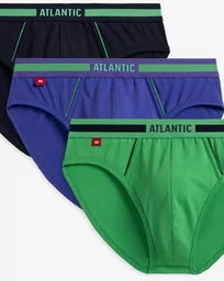 Slipy męskie z gumą zewnętrzną Atlantic model 3MP-159 z serii sport w zielonym kolorze. Męskie slipy w stylu sportowym, charakteryzujące się wysokim podkrojem wokół, oraz niskim stanem zakończonym komfortową gumą wewnętrzną, która nie uciska talii. Zapewniają idealne dopasowanie do sylwetki, podkreślając jej atuty. Opakowanie zawiera 3 sztuki. Wykonane z wysokiej jakości materiałów, składają się z 95% bawełny i 5% elastanu.
