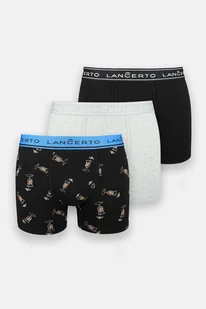 Zestaw bielizny męskiej w trójpaku. Set zawiera trzy sztuki bokserek. Dwie pary gładkie kolorach: czarnym i szarym oraz jedną granatową z nadrukiem w drinki....