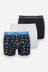 Zestaw trzech męskich bokserek LANCERTO. Komplet zawiera trzy pary. Gładkie szare i czarne oraz granatowe z nadrukiem w hantle i ciężarki idealne dla fana ...