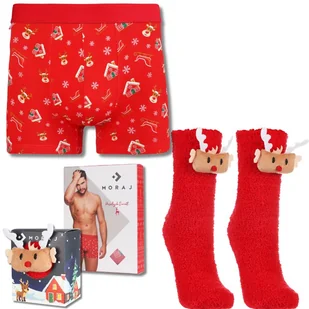 Pakiet Męski Świąteczny MORAJ – Bokserki XL + Skarpety Frotte z Reniferem 3D UniSize Szukasz idealnego prezentu dla niego? Ten pakiet męski MORAJ to połączenie praktyczności, wygody i świątecznego humoru! W zestawie znajdziesz świąteczne bokserki oraz ciepłe skarpety frotte z uroczym reniferem 3D. To doskonały pomysł na Mikołajki, pod choinkę lub jako zabawny upominek dla bliskiej osoby. Cechy zestawu: Świąteczne bokserki męskie – wykonane z miękkiej, elastycznej bawełny, gwarantują wygodę i doskonałe dopasowanie Zabawny design – świąteczny motyw wprowadza radosny klimat Skarpetki frotte z reniferem 3D – puszyste, miękkie i ciepłe, idealne na zimowe dni Motyw renifera z rogami 3D – oryginalny detal, który wyróżnia skarpety Warstwa ABS na podeszwie – antypoślizgowa ochrona i większy komfort Pakiet świąteczny – praktyczny i zabawny prezent, który wywoła uśmiech Całość zapakowana w eleganckie kartoniki prezentowe, dzięki czemu zestaw jest gotowy do wręczenia bez potrzeby dodatkowego pakowania. Skład: Bokserki: 95% Bawełna, 5% Elastan Skarpetki: