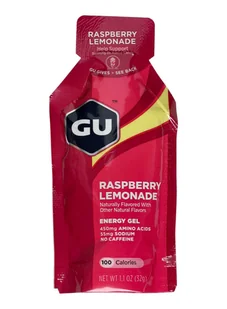 Żel GU Raspberry Lemonade - najważniejsze cechy: Smak malinowej lemoniady;100 kalorii i 23 g węglowodanów w jednym żelu;Bez kofeiny;Odpowiedni dla wegan;Bez glutenu;Bez laktozy;Waga netto: ok. 32 g.