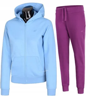 Damski dres sportowy 4F Marka/model: 4F SWSF1763 / TROF606 Kolor: Bluza jasna niebieska / spodnie fioletowe Materiał bluza: 80% bawełna, 20% poliester Materiał spodnie: 77% bawełna, 23% poliester, Nieocieplane wnętrze 2 kieszenie boczne w bluzie 2 kieszenie boczne w spodniach Ściągacz na dole i przy rękawach Zintegrowany kaptur O marce: