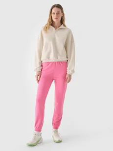 Dresy 4F dla kobiety są wykonane w 79% z bawełny, dzięki czemu są miękkie, trwałe i przyjemne w dotyku. Dodatek poliestru (21%) sprawia, że materiał utrzymuje fason i jest odporny na zużycie nawet przez wiele sezonów. Spodnie nie posiadają podszycia, dzięki czemu są lżejsze i odpowiednie na cieplejsze dni. Po bokach znajdują się 2 kieszenie otwarte. Elastyczny pas bez regulacji.