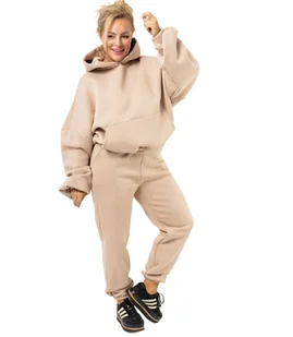 Ten dwuczęściowy, ocieplony komplet dresowy to połączenie najnowszych trendów z niezrównaną wygodą. Gruby, mięsisty materiał sprawia, że jest to idealna propozycja na chłodne dni. Górna część: Krótka Bluza Hoodie Oversize Fason: Krótki i Oversize – luźny korpus, który świetnie pasuje do spodni z wysokim stanem.
