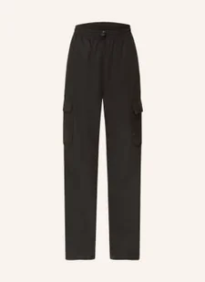 Wysoki stan. Proste nogawki. Elastyczny, marszczony pas w talii z tunelem z troczkiem. Boczne kieszenie wpuszczane. Kieszenie cargo na nogawkach.