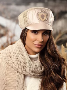 Komplet damski szalik i kaszkiet w kolorze beżowym ozdobiony warkoczowym splotem oraz wszytą aplikacją w kształcie herbu. Wykonany z trwałego i nieprzemakalnego ortalionu. Posiada ciepłą podszewkę i regulację w postacie gumki, dzięki czemu idealnie dopasowuje się do kształtu głowy. Ciepły szal i kaszkiet to podstawa udanego outfitu na chłodne dni. Szalik może swobodnie opadać wzdłuż ciała, zdobiąc elegancką stylizację, a także otulać szyję w mroźne dni.