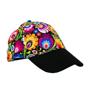 Folkowa czapka z daszkiem - łowicka Czarna czapka z daszkiem ozdobiona kolorowym wzorem kwiatowym inspirowanym wycinanką łowicką. Dzięki paskowi do regulacji...