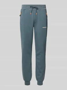 Spodnie dresowe męskie Jack & Jones;Mieszanka materiałów z dodatkiem bawełny;Krój slim fit;Model ‘Gordon’;Nadruk z logo;Elastyczny pas z tunelem;Kieszenie wpuszczane zapinane na zamek błyskawiczny;Fakturowany wzór;Elastyczne zakończenia nogawek;Długość wewnętrzna nogawki w rozmiarze M: 79 cm