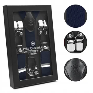 kolor: granatowy szerokość paska: 3,5 cm całkowita długość mierzona na płasko bez rozciągania: 118 cm trwałe i komfortowe posiadają wygodną regulację długości zapinane na metalowe żabki płynna regulacja długości tylna część szelek w kształcie litery Y posiadają skórzane elementy wykończenia materiał: 30% poliester, 70% elastan producent: Pako Jeans model: