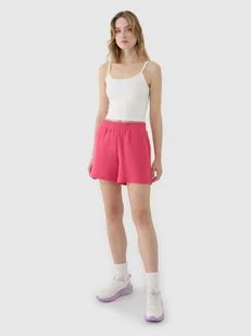 Spodenki dresowe damskie idealnie sprawdzą się jako element zarówno casualowych, jak i sportowych stylizacji na co dzień. Posiadają krój regular, który wygodnie dopasowuje się do sylwetki oraz krótkie nogawki do połowy uda. Damskie spodenki dresowe są wykonane w 48% z modalu, który jest delikatny i gładki w dotyku, co daje niezwykle przyjemne odczucie na skórze. Dzięki swojej strukturze materiał jest miękki, sprężysty i przewiewny, a ponadto bardzo dobrze pochłania wilgoć. Dodatek poliestru (45%) sprawia, że materiał utrzymuje fason i jest odporny na zużycie nawet przez wiele sezonów.