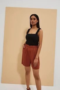 100%WISKOZA Brązowe, krótkie spodenki z szerokimi, prostymi nogawkami. Gładki materiał, bez wzorów. Marszczona talia z wszytą gumą. Z przodu dwie duże kiesze...