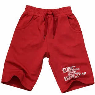 Krótkie spodenki z nadrukiem długość do kolana w kolorze bordowym na dole lewej nogawki napis po bokach wewnętrzne kieszonki w pasie gumka z przodu ozdobny s...