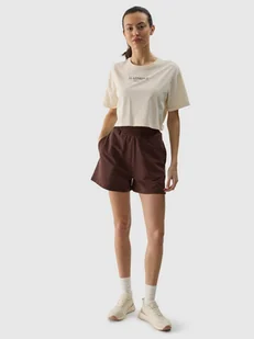 Szorty dresowe damskie wykonane z dzianiny o średniej gramaturze 300 gsm, która sprawia, że są one miękkie oraz bardziej przewiewne. Spodenki nie posiadają podszycia, dzięki czemu są lżejsze. Po bokach znajdują się 2 kieszenie otwarte. Elastyczny pas bez regulacji.