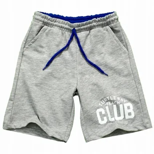 Spodenki dresowe z nadrukiem długość do kolana w kolorze szary melanż na lewej dole lewej nogawki napis po bokach wewnętrzne kieszonki w pasie gumka z przodu...