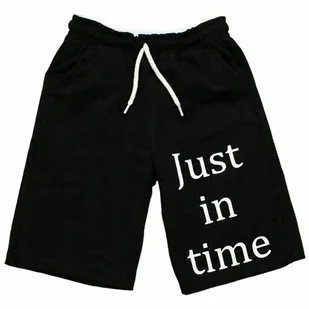 Krótkie spodenki z nadrukiem długość do kolana w kolorze czarnym na lewej lewej nogawce napis po bokach wewnętrzne kieszonki w pasie gumka z przodu sznurecze...