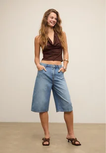 Bermudy jeansowe ze średnim stanem, szlufkami, kieszeniami z przodu, kieszeniami naszytymi z tyłu i prostymi nogawkami. Z przodu zapięcie na suwak kryty listwą oraz metalowy guzik. Dostępne w różnych kolorach.