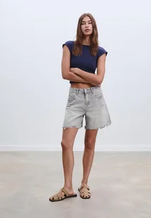 Spodenki z wysokim stanem, pięcioma kieszeniami i nieobrębionymi nogawkami. Zapinane na metalowy guzik i suwak kryty listwą. Dostępne w różnych kolorach.