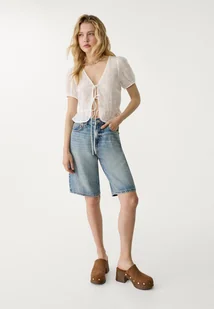 Bermudy jeansowe ze średnim stanem, kieszeniami z przodu, kieszeniami naszytymi z tyłu, szlufkami i zapięciem na suwak i metalowy guzik. Dostępne w różnych kolorach.