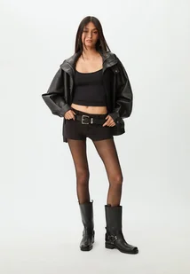Mini spodenki ze średnim stanem i szeroką talią z detalami w postaci szlufek. Dopasowana nogawka. Zapięcie z przodu na zamek błyskawiczny, ukryty guzik i metalowy element.
