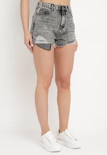Szare Jeansowe Bawełniane Szorty z Wysokim Stanem i Wystrzępionymi Nogawkami Ozdobione Cyrkoniami Moara