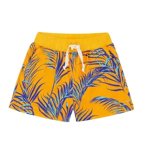 Szorty bawełniane, pomarańczowe w niebieskie liście Bawełniane szorty w soczystych, letnich kolorach. Model doskonały na wakacyjne wyjazdy, a także codzienną...