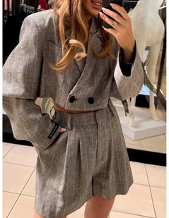 Wiskozowe krótkie spodenki w prążek VIANA - szare Te krótkie spodenki to połączenie kobiecego stylu i wygody, które pokochasz na nowy sezon! Wykonane z przewiewnej mieszanki – len z wiskozą – gwarantują komfort nawet w najbardziej słoneczne dni. Z tyłu w pasie wszyta guma zapewnia idealne dopasowanie do sylwetki, a szlufki i pasek z tego samego materiału pozwalają na stylowe związanie w talii. Drobne pionowe prążki optycznie wysmuklają nogi i dodają elegancji całej stylizacji. To model, który świetnie sprawdzi się zarówno w miejskim looku z oversizową marynarką i topem, jak i w wakacyjnym zestawie z ażurową bluzką i espadrylami. Dzięki klasycznej długości i wysokiemu stanowi, spodenki pięknie podkreślają figurę.