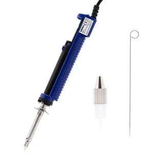 Elektryczny odsysacz lutowniczy 30W Yihua 929D-V z dodatkowym grotem i wyciorem Profesjonalny odsysacz lutowniczy, przeznaczony do usuwania cyny, urządzenie bardzo szybko rozgrzewa się do temperatury potrzebnej do pracy. Solidna konstrukcja pozwala na bardzo efektywną prace jedną reką. Bardzo przydatne urządzenie ułatwiające wylutowywanie elementów elektronicznych. Instrukcja: Włącz zasilanie, podgrzej wstępnie przez 3-5 minut; Wciśnij uchwyt tłoka, skieruj dysze ssącą na element który chcesz wylutować; Po stopieniu cyny naciśnij przycisk odsysania, lut zostanie zasysany do cylindra; Odsysacz cyny jest wyposażony w dwie dysze ssące o różnej średnicy, które można dostosować w zależności od potrzeb.