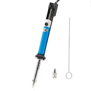 Elektryczny odsysacz lutowniczy 30W z dodatkowym grotem i wyciorem Profesjonalny odsysacz lutowniczy, przeznaczony do usuwania cyny, urządzenie bardzo szybko rozgrzewa się do temperatury potrzebnej do pracy. Solidna konstrukcja pozwala na bardzo efektywną prace jedną reką. Bardzo przydatne urządzenie ułatwiające wylutowywanie elementów elektronicznych. Instrukcja: Włącz zasilanie, podgrzej wstępnie przez 3-5 minut; Wciśnij uchwyt tłoka, skieruj dysze ssącą na element który chcesz wylutować; Po stopieniu cyny naciśnij przycisk odsysania, lut zostanie zasysany do cylindra; Odsysacz cyny jest wyposażony w dwie dysze ssące o różnej średnicy, które można dostosować w zależności od potrzeb.