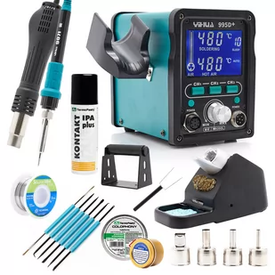 Stacja lutownicza 2w1 Yihua 995D+ + KIT 17 Najnowszy model stacji lutowniczej 2w1, urządzenie sprawdzi się do profesjonalnych warsztatów jak i dla hobbistów. W porównaniu ze starą wersją posiada odpinaną kolbę gorącego powietrza oraz pamięć trzech temperatur. Zamieniona została również podstawka do lutownicy, wyposażona jest teraz w gąbkę, czyścik z wiórkami do czyszczenia grotów, kalafonię, miejsce na zapasowe groty oraz uchwyt na szpulę cyny, nowa podstawka jest również bardziej stabilna, przez co jest bardziej wygodna w użyciu, oraz charakteryzuję się nowoczesnym designem. KIT 17 zawiera niezawodne akcesoria, które ułatwią twoją pracę i świetnie dopełnią wyposażenie twojego warsztatu. DODATKOWO KIT 17: