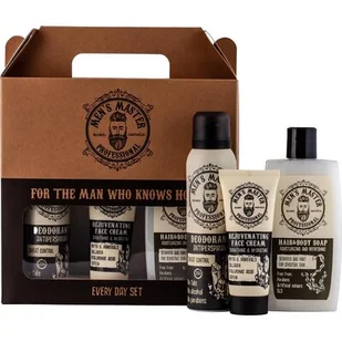 Zestaw upominkowy dla mężczyzn zawiera mydło w płynie do ciała i włosów, odmładzający krem do skóry oraz dezodorant w sprayu - antyperspirant.