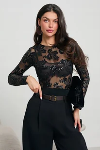 Body wykonane jest z delikatnej, prześwitującej siateczki typu mesh, która subtelnie podkreśla sylwetkę. Pokryte efektownym, cekinowym haftem w roślinny wzór, pięknie odbija światło i tworzy elegancki, wieczorowy charakter. Dopasowany krój podkreśla talię, a elastyczny materiał zapewnia wygodę noszenia. Idealne do zestawienia z eleganckimi spodniami lub spódnicą na specjalne okazje, kolacje, święta czy imprezy. Łączy w sobie zmysłowość i klasę, nadając stylizacji wyjątkowego, szykownego wyrazu.