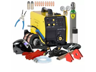 Wyposażenie standardowe: urządzenie spawalnicze uchwyt spawalniczy MB-15 / 3 m rolka podajnika fi 0,8 / 1,0 mm V-kształtna (zamontowana) przewód zasilający z wtyczką przewód masowy / wtyk 25 mm2 / 2 m przewód elektrodowy / wtyk 25 mm2 / 200 A / 2 m instrukcja obsługi w języku polskim Pakiet akcesoriów 1: preparat antyodpryskowy 400 ml drut spawalniczy samoosłonowy FLUX 0,8 mm / 0,9 kg rękawice spawalnicze 1 para dysza gazowa 2 szt. końcówka prądowa 5 szt. elektrody spawalnicze rutylowe / 1 kg Pakiet akcesoriów 2: