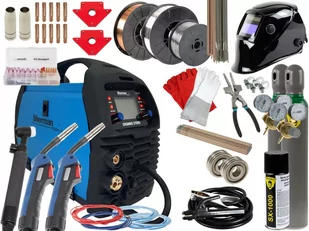 końcówka prądowa 5 szt. elektrody spawalnicze rutylowe / 1,0 kg Pakiet akcesoriów 2: preparat antyodpryskowy 400 ml drut spawalniczy SG2 0,8 mm / 5,0 kg reduktor gazu MINI 2 manometry butla z mieszanką ARG/CO2 8 litrów (nowa, pełna, 10-letnia legalizacja, kołpak chroniący zawór) rękawice spawalnicze 1 para dysza gazowa 2 szt. końcówka prądowa 5 szt. elektrody spawalnicze rutylowe / 1,0 kg wąż do podłączenia butli z redukt.