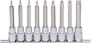 Torx wewn?trzna nak?adka czterok?tna zgodna z DIN 3120 / ISO 1174 z blokad? kulkow? model d?ugi z wciskanym, niklowanym wk?adem bitowym do obs?ugi r?cznej chromowany na wysoki po?ysk chrom-wanad wraz z szyn? nasadzan?