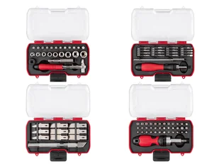 Opis produktu Zestaw z ostrzami do precyzyjnych cięć: 1x rękojeść noża z włożonym ostrzem nr 20 9x różne. ostrza precyzyjne: 2 x nr 22 3 x nr 2 4 x nr 21 Zestaw wkrętaków z grzechotką: 1 x wkrętak z uchwytem dwukompone